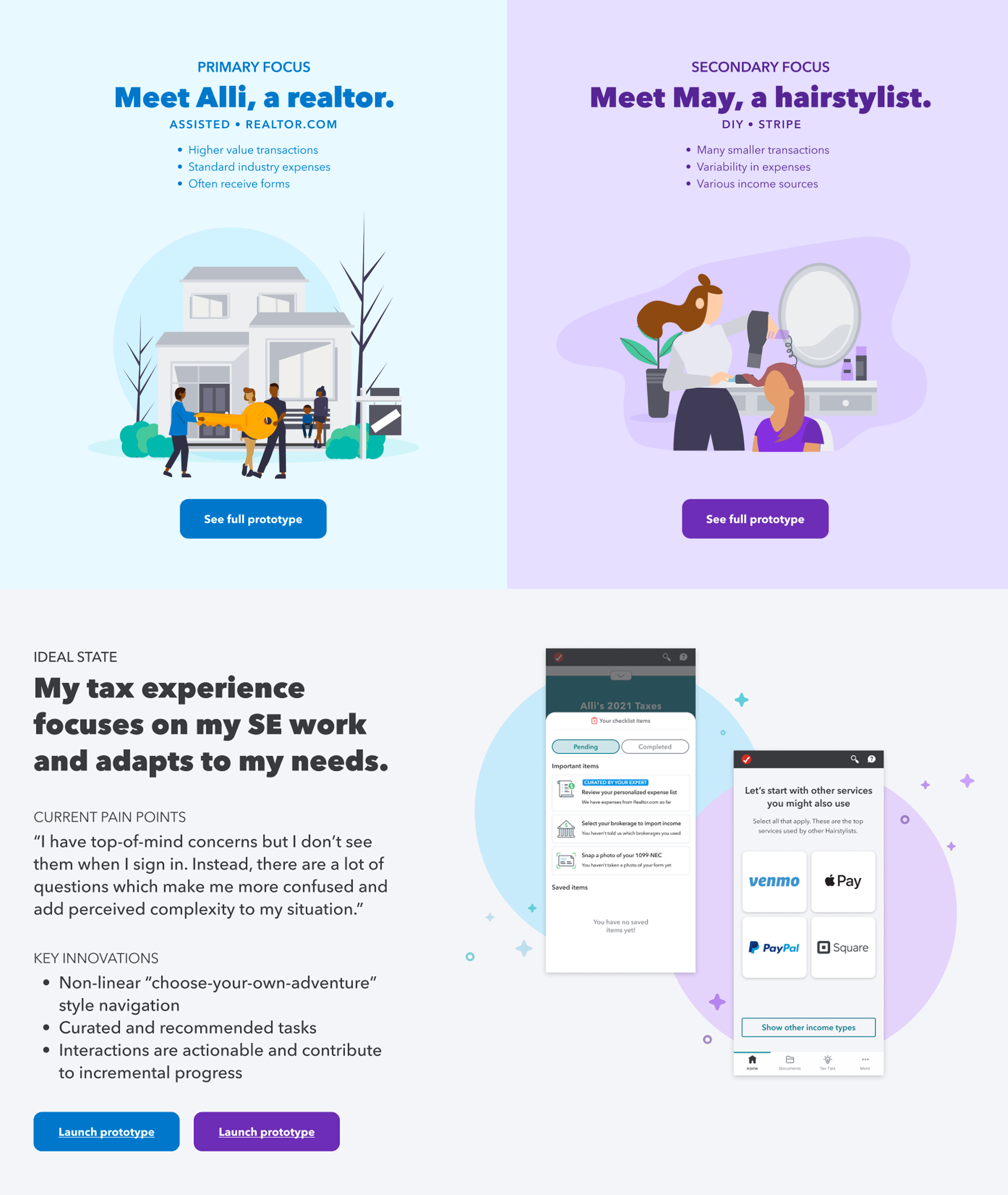 Impact: By the end of week 2, the teams had prototyped and tested over 50 divergent ideas. In week three, we narrowed on the best of the batch to create a three year vision that covered all end to end touch points for premium customers using Turbotax’s core DIY offering—which also served as our north star fueling the current year’s roadmap.